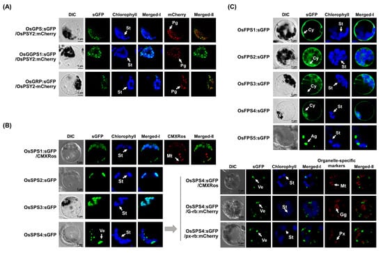To investigate the subcellular localization of rice PTs, synthetic green fluorescent protein (sGFP) was fused to their C-termini and transfected into the leaf protoplasts prepared from 10-day-old rice seedlings (Figure 6). For rice Group I families, green fluorescence for OsGPS:sGFP, OsGGPS1:sGFP and OsGRP:sGFP were similarly observed to be spread in stroma with strong spot-like patterns inside chloroplasts (Figure 6A). Two latter ones were also strongly detected in stroma (Supplementary Figure S3). To verify the subcellular structure of these spot-like patterns, an OsPSY2:mCherry construct, which is targeted into plastoglobules [38], was individually co-transfected. Green fluorescence exactly merged with red fluorescence, indicating that OsGPS, OsGGPS1 and OsGRP proteins localize mainly to both plastoglobules and stroma of chloroplasts. For rice Group II PTs, OsSPS1:sGFP, OsSPS2:sGFP, OsSPS3:sGFP and OsSPS4:sGFP were transfected into rice protoplasts and their green fluorescence resulted in different patterns in localization (Figure 6B). OsSPS1 was localized in two places of stroma and strong spot-like patterns outside chloroplasts. To verify the cellular compartmentation of OsSPS1, the Red CMXRos fluorescent signals of MitoTracker as a mitochondrial marker probe were presented as yellow signals. These signals matched with green fluorescence of OsSPS1:sGFP, indicating the dual localization to stroma and mitochondria. OsSPS2:sGFP and OsSPS3:sGFP were localized to stroma of chloroplasts. The green fluorescence for OsSPS4:sGFP was observed as big spot-like patterns, but were still in cytoplasm. To verify these unusual signals, three organelle-specific markers of MitoTracker, G-rb for Golgi apparatus and px-rb for peroxisomes with red fluorescence were co-transfected, but did not merge with the green fluorescent signal of OsSPS4:sGFP at all, proposing its cytosolic localization into some kinds of vesicles. For rice Group III PTs, five sGFP fusion constructs with OsFPS1–5 were individually transfected into rice protoplasts (Figure 6C). OsFPS1–4 nicely showed cytosolic localization patterns, but OsFPS5 was aggregated as a few big-spots, but still in cytoplasm (Figure 6C).
