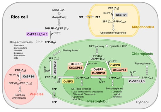 The networking model of rice trans-PTs based on subcellular topology. The subcellular organelles are colored: Chloroplasts with plastoglobules (green with dark green), mitochondria (beige) and cytosol with vesicles (light-gray with pink). Rice trans-PTs have colored background in yellow (OsGPS), orange (OsGGPS1), pale orange (OsGRP), grey (OsSPSs) and purple (OsFPSs). DMAPP, dimethylallyl pyrophosphate; FPP, farnesyl pyrophosphate; FPS, FPP synthase; GFPP, geranylfarnesyl pyrophosphate; GFPS, GFPP synthase; GPP, geranyl pyrophosphate; GPS, GPP synthase; GGPP, geranylgeranyl pyrophosphate; GGPS, GGPP synthase; PPP, polyprenyl pyrophosphate; PPS, PPP synthase; SPP, solanesyl pyrophosphate; SPS, SPP synthase. Allelic substrates and main actors among PTs with the same enzymatic activity are bolded.