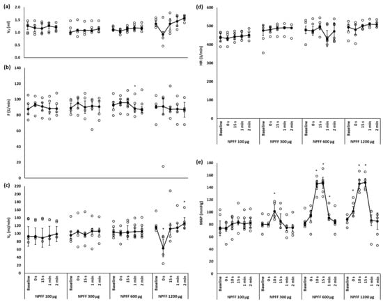 Changes over time of (a) tidal volume (VT); (b) frequency of breathing (F), (c) minute ventilation (VE), (d) heart rate (HR) and (e) mean arterial blood pressure (MAP) after iv injection of various doses of NPFF. Significant drop in VE is produced by the highest dose of NPFF. Short-lived increase in MAP is evoked mostly by the two highest doses of NPFF. The data are presented as median ± QD; * p < 0.05 vs. baseline value; n = 5–6 per dose.