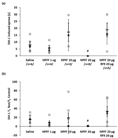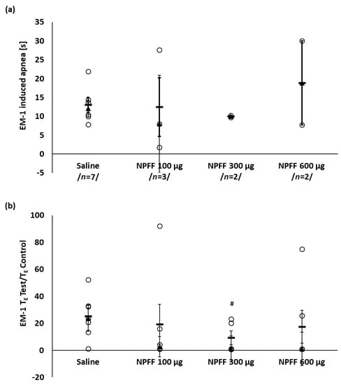 The effect of iv injected NPFF on the number and duration of EM-1-induced apneas (a) and TE test/TE control ratio (b). The data has been shown as median ± QD (▲, thin whiskers) and mean ± SEM (−, bold whiskers); ○ episode of apnea or TE test/TE control ratio of a single rat. The number of apnea episodes are shown in-between slashes (a). Mann–Whitney test: # p < 0.05 vs. control (saline) group. Total number of tested animals per each NPFF dose: n = 5–7.
