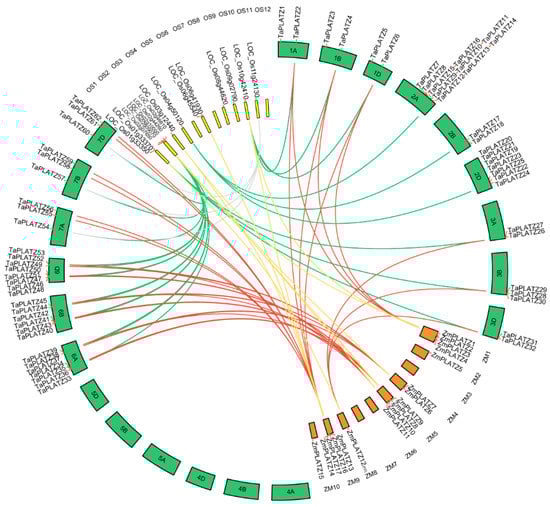 Collinear relationships between 62 TaPLATZ genes, 15 OsPLATZ genes, and 17 ZmPLATZ genes were analyzed for a better understanding of PLATZ genes evolution (Table S2, Figure 2). A total of thirty TaPLATZ genes showed collinear relationships with those in maize and rice, indicating that these orthologous pairs may already exist before the ancestral divergence. In addition, some TaPLATZ genes were associated with two orthologous genes located on different chromosomes, such as collinear gene pairs (TaPLATZ54, TaPLATZ57, TaPLATZ60, LOC_Os08g44620, and LOC_Os11g24130). Some collinear gene pairs were detected only in wheat and rice, such as TaPLATZ7, TaPLATZ17, TaPLATZ20.
