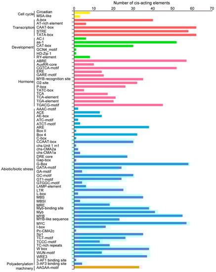 The number of cis-acting elements contained in the promoters of TaPLATZ genes. The cis-acting element was identified with the online PlantCARE program using the 2k upstream from the transcription start site of TaPLATZ genes. The graph was generated based on the presence of cis-acting elements related to different conditions (x-axis) in 62 TaPLATZs (y-axis). The number of cis-acting elements involved in different regulatory pathways. Yellow columns refer to cell cycle, red columns represent transcription, green columns represent of the development process, blue columns refer to abiotic and biotic stress, orange columns represent the polyadenylation machinery.