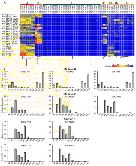 A variety of TaPLATZ gene expression patterns was shown in the heat map (Figure 5A). TaPLATZs genes in Module a displayed a continuous expression except in the early stage of seed development, and TaPLATZs genes in Module b presented a seed-specific expression pattern. Moreover, root-specific expression patterns can be found in Module d, indicating the functionally important and nonredundancy of TaPLATZ genes. TaPLATZ genes clustered in one subfamily could exhibit different expression patterns. For example, members in Group II were clustered into three modules, revealing that functional divergence and the biased expression of duplicated genes appear to be major factors promoting their retention in the genome [37,38]. It is noteworthy that the expression patterns of seven TaPLATZs (TaPLATZ26 to TaPLATZ32) contained in Group II were highly similar to those of ZmPLATZ12 (Fl3) and LOC_Os01g33350, LOC_Os01g33370, which displayed invariant seed-specific expression pattern in the early stage of seeds. These conserved expression patterns reflect that these TaPLATZs may be involved in seed development and maturation, indicating the possibility of their participation in the common metabolic and or developmental processes of wheat [8,12].