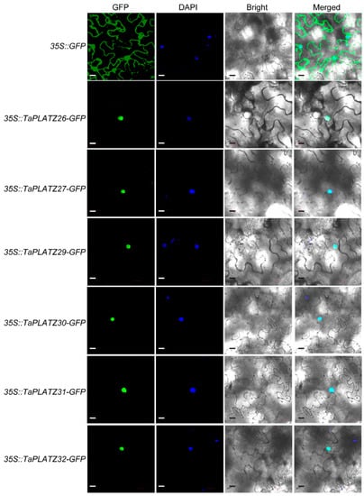 The predicted cellular localization by four different software programs showed that six TaPLATZ proteins (TaPLATZ26, TaPLATZ27, TaPLATZ29, TaPLATZ30, TaPLATZ31, and TaPLATZ32) were located in the nucleus (Table S1). Six TaPLATZ proteins were subsequently chosen to verify the subcellular localization by performing the transient expression. They were fused to a green fluorescent protein (GFP), and the constitutive 35S promoter drove all gene cassettes. The free GFP was used as the control. We transiently expressed the resulting constructs in tobacco leaves. Green fluorescence signals of all fusion proteins were localized in the nucleus (Figure 6), consistent with their predicted function as TFs, whereas the control 35S::GFP was detected both in the nucleus and cytoplasm ubiquitously. These results are in accordance with most transcription factors, which were located exclusively at the nucleus, suggesting that the TaPLATZs likely perform a function as a conventional transcription factor.