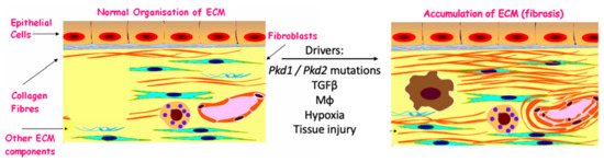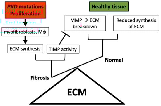 Tissue homeostasis requires a fine balance of matrix production and breakdown. Yet when the balance breaks, here due to somatic mutations in one of two genes (i.e., PKD1 or PKD2, collectively referred to as PKD), there is an observed increased proliferation of matrix producing cells (e.g., myofibroblasts and Mφ), leading to excess ECM synthesis. To make matters worse in rodent models of PKD and also in people suffering with this condition, elevated levels of TIMPs have been identified. TIMPs inhibit the activity of the molecules that break down matrix (MMPs), further contributing to the establishment of fibrosis, which ultimately leads to organ failure. On the contrary, in the healthy kidney, there is both a lower rate of ECM production and also a tightly controlled ECM breakdown pathway.