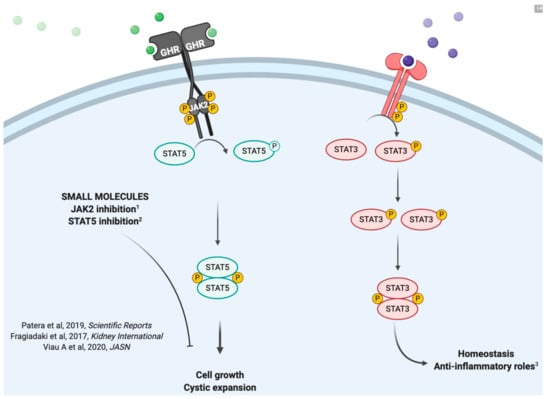The role of JAK/STAT in cystic disease. The JAK/STAT family of evolutionarily conserved Janus Kinase and Signal Transducers and Activators of Transcription plays a key role in driving cystic growth in ADPKD. Specifically, JAK2-triggered STAT5 enhances cystic growth [20], and consistent with this, inhibition of JAK2 limits this [58]. On the other hand, STAT3, which can also be activated by JAK2, provides a homeostatic control, that when switched off leads to excessive renal inflammation [57].