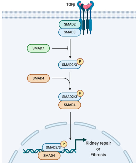 EMT is regulated by numerous growth factors, cytokines and hormones. TGFβ is one of the most important profibrotic factors in the kidney since it can not only initiate but can also maintain EMT [65]. Importantly, the actions of TGFβ can be counteracted by Bone Morphogenic Protein-7 (BMP-7), which is highly expressed in the kidney [66]. In mammals, the TGFβ family consists of 3 members (TGF-β1, TGF-β2 and TGF-β3), which have similar biological effects. The 3 cytokines belong to a larger family, the TGFβ superfamily, which also contains proteins such as bone morphogenetic proteins (BMP) [67]. TGFβ binds to TGFβ receptor 1 and 2 and triggers a signalling pathway that involves phosphorylation and transcriptional activation of SMAD2/3/4 transcription factors (Figure 4). TGFβ has been reported by several investigators to promote wound healing, tissue repair and regeneration after initial insult, such as inflammation as well as tissue fibrosis [68,69,70], and to be anti-inflammatory [71]. However, recent studies have uncovered a pro-inflammatory role for TGFβ in the development of plaque and atherosclerosis [72], suggesting that the role of this important transcription factor is complex and possibly tissue and trigger specific. TGFβ, apart from its roles in immune regulation, is a well-studied profibrotic molecule involved in progressing renal fibrosis by orchestrating a crosstalk between parenchymal, inflammatory and collagen expressing cells (e.g., fibroblasts). It is mainly produced by both resident renal cells and infiltrating macrophages but it is also made by monocytes, lymphocytes, platelets, fibroblasts and osteoblasts.