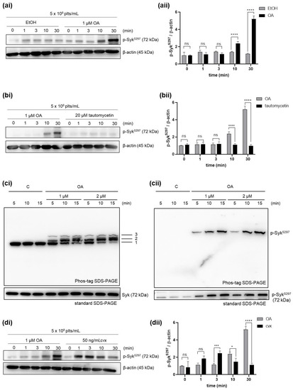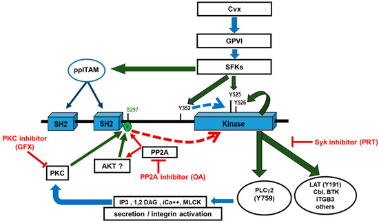 Interestingly, the inhibition of PP2A under these conditions showed only minimally inhibitory effects on the Cvx-stimulated phosphorylation of Syk Y352 and S297, which are both located in the interdomain-B of Syk (Figure 3c). However, these data (Figure 3ci,cii and Figure 4) showed that OA pretreatment prolonged Cvx-induced Syk S297 phosphorylation.