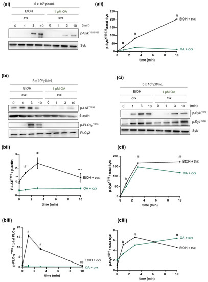 Samples from the same experiment shown in Figure 4 were also analyzed for Y-phosphorylation of Syk and Syk substrates (Supplementary Material Figure S1). Incubation of platelets with OA prior Cvx stimulation strongly inhibited Syk Y525/526 (Supplementary Figure S1a) and Syk Y352 phosphorylation (Supplementary Material Figure S1b). In order to validate the functional outcome of this inhibitory effect, we also studied the Y-phosphorylation of the Syk substrates LAT and PLCγ2 (Supplementary Material Figure S1c). Phosphorylation of LAT Y191 and of PLCγ2 Y759 was strongly inhibited (Supplementary Material Figure S1ci–ciii).