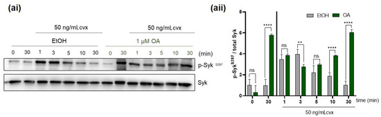 We aimed to extend our observations on the direct effect of OA on Syk S297 phosphorylation evoked by Cvx. Therefore, we pretreated washed platelets with vehicle control (EtOH) or with OA (1 µM) for 30 min, and then with Cvx (50 ng/mL). We previously showed that Cvx induces transient S297 phosphorylation. Our data here demonstrate that PP2A inhibition prolongs Syk S297 phosphorylation up to 30 min after Cvx stimulation (Figure 4), best seen at the time points 5–30 min after Cvx addition. The trough-like appearance of Syk S297 phosphorylation in the OA/Cvx combination (Figure 4aii) suggested that two components of S297 phosphorylation were present, one stimulated by the Cvx/Syk-kinase dependent PKC activation [33] and one by the alternative kinase system activated by OA. However, the OA pretreatment inhibited Syk activity (Figure 3, also Supplementary Figure S1), and may therefore partially reduce Syk S297 phosphorylation in the early phase after Cvx stimulation.