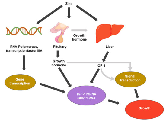 Zinc is involved in the regulation of cell growth via several pathways. It is essential for the enzymatic system that governs cell division and proliferation. Zinc appears to be essential for the induction of cell proliferation by pituitary growth hormone (GH) and IGF-1. IGF-1 is one of the most critical activators of the protein kinase B (Akt) signaling pathway and it stimulates cell growth and proliferation. The mediation of cell division by growth factors requires the binding of a ligand to its cognate receptor, which activates intracellular signaling pathways [15,30,31] (Figure 1).