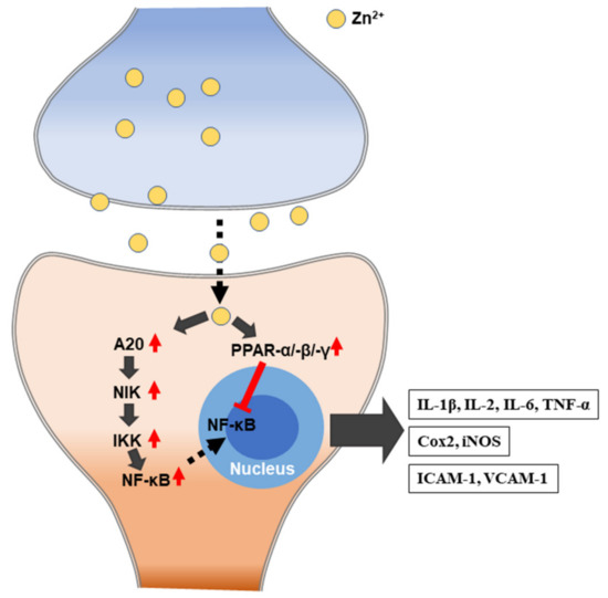 Microglia are a specific class of immune cells in the central nervous system (CNS) [115,116]. When the CNS is challenged by infection, tissue injury, or other damage signals, it transforms into an activated form, which is termed the “ameboid”, and releases matrix metalloproteinases, reactive oxygen species (ROS), and other pro-inflammatory factors. Zinc is released by neurons under several conditions that cause microglial activation, and zinc chelation can reduce neuronal death in models of cerebral ischemia and neurodegenerative disorders. Kauppinen et al. (2008) showed that zinc directly triggers microglial activation. Zinc-induced microglia were transfected with a nuclear factor-κB (NF-κB) reporter gene, which showed a several-fold increase in NF-κB activity, which was blocked by inhibiting poly(ADP-ribose) polymerase-1 (PARP-1) and NADPH oxidase [117]. The connection between zinc and microglial activation represents a novel, unrecognized mechanism that may contribute to neuropathy.