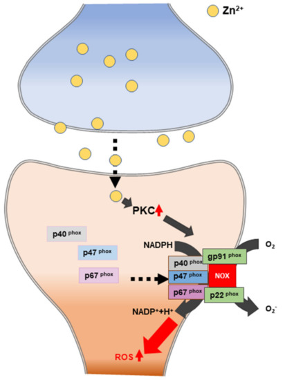 One of the major mechanisms of zinc-induced neuronal cell death is known as oxidative stress. Previous studies have shown that zinc exposure significantly increases the levels of the NADPH oxidase subunit in both neurons and astrocytes [133,134]. NADPH oxidase is activated by protein kinase C (PKC), which is a key enzyme driving oxidative stress generation [135,136]. NADPH oxidase is a superoxide-generating enzyme that is composed of components located in the membrane (glycosylated 91-kDa glycoprotein (gp91PHOX) and p22PHOX) and located in the cytoplasm (p47PHOX, p40PHOX, and p67PHOX) [137,138] (Figure 4). The dynamic relationship between zinc and ROS is strongly associated with neuronal cell death in zinc-accumulation diseases, such as traumatic brain injury, ischemic stroke, and hypoglycemia [93].