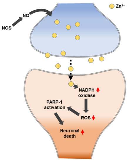 The excitotoxic stimulation that occurs during ischemia or sustained status epilepticus releases a large amount of glutamate and zinc from presynaptic terminals, which leads to a large amount of zinc influx into postsynaptic neurons [123,131,132]. Increased intracellular free zinc that is driven by several deleterious stimuli causes extensive neuronal death [13].