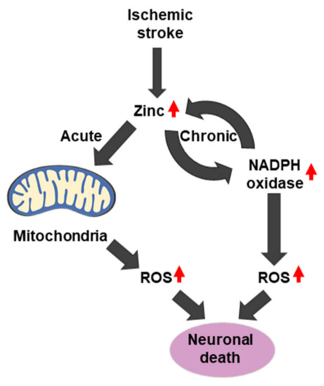 In ischemic stroke, two sources of ROS production exist, including the production of mitochondrial ROS by the release of zinc. Interestingly, in the chronic phase, zinc accumulation activates neuronal NADPH oxidases. ROS that is produced by NADPH oxidase further increases zinc accumulation, leading to cell death and ischemic brain injury [185,186] (Figure 4 and Figure 6).