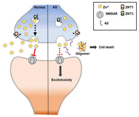 The NMDA receptor contributes to zinc toxicity by providing a route of the zinc influx pathway into neurons. In other words, the mis-compartmentalization of zinc in AD interferes with signaling by the NMDA receptor, which can lead to intracellular excitatory toxicity [196] (Figure 7). Additionally, zinc deficiency (or low levels of zinc) is commonly found in AD patients, and most cases show that it worsens AD-induced memorial deficits and behavioral outcomes. In mouse models, it has been shown that a zinc-deficient diet causes memory decline. Zinc deficiency is also suggested to cause changes in behavior and mood, including depression and anxiety [197].