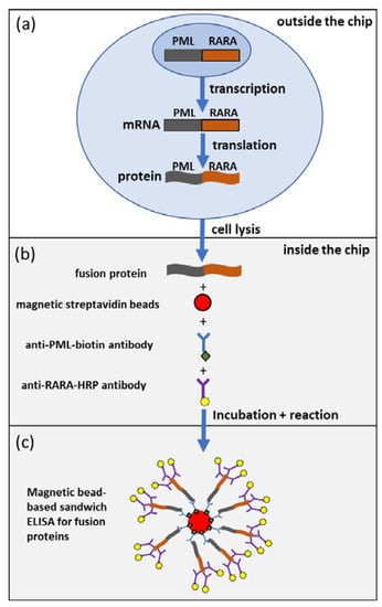 The diagnosis of APL is of utmost importance for effective patient care by early initiation of a tailor-made therapy. Due to the acute and life-threatening bleeding, a diagnosis of APL should be made in a few hours and not in several days. Cytomorphological examinations, immunophenotyping combined with karyotyping are usually accomplished within one day. Molecular genetic analysis using RT-PCR and FISH usually take 1–3 days, as these are limited to specialized laboratories and well qualified staff. Not every laboratory is able to perform these analyses. Due to these points, new specific detection methods for PML-RARα are necessary. We have developed a method to detect the fusion protein PML-RARα in cell lysates by a sandwich ELISA on the surface of magnetic particles in a microfluidic chip in less than one hour.
