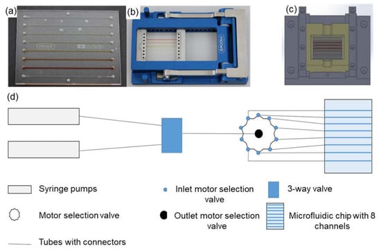 In order to create the biological system (Figure 1), we tried to develop the right microfluidic chips (Figure 2). The microfluidic chip measures 50 mm × 35 mm with eight microfluidic channels integrated at a pitch of 2 mm. The channels are filled via inlets on the upper side (Figure 2a). The chip holder is used to connect the tubes with the microfluidic chip. Tubes with an outside diameter of 1/16′ are pushed into a connector with eight holes and sealing rings. The chip is clamped under the connector and sealed tightly (Figure 2b) by light lifting action.