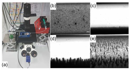 Fluidic analysis of magnetic beads through the microfluidic chip. Shown is the analysis of the fluidic behavior of the magnetic beads in the microfluidic channel and the influence of a neodymium magnet on them. Under (a) the experimental setup consisting of a syringe pump, tubes, connectors and a microfluidic chip in the chip holder is shown. The following pictures were taken with the microscope axiovert 40 CFL. The first image (b) shows the magnetic beads evenly spread in the channel at 100× magnification. The syringe pump is switched off and there is no flow rate. The next microscopic image (c) shows the beads in the channel with a magnet parallel to the channel. The volume flow is 10 µL/min. The magnetic beads form an approx. 80 µm-wide layer along the channel (black arrow). Due to the magnetic forces, this layer adheres to the channel wall and the beads are not flushed out of the channel. If the magnet is positioned about 5 cm away from the channel, the attraction to the beads is reduced. The bead layer parallel to the channel is no longer as homogeneous and dense (grey arrow, (d)). The flow rate is again 10 µL/min. Beads that reach far into the channel are rinsed out of the channel by the fluid flow. In the last part of figure (e), the pump was switched off and the magnet was removed. The beads begin to spread evenly in the channel again. The process shown in Figure 1 can be used to implement washing steps for magnetic beads in the microfluidic channel.