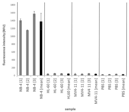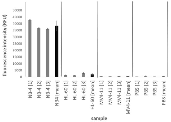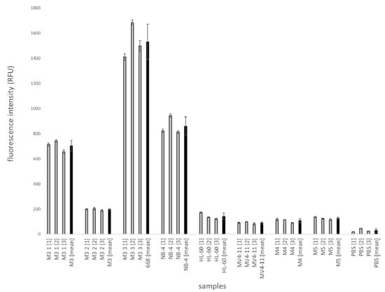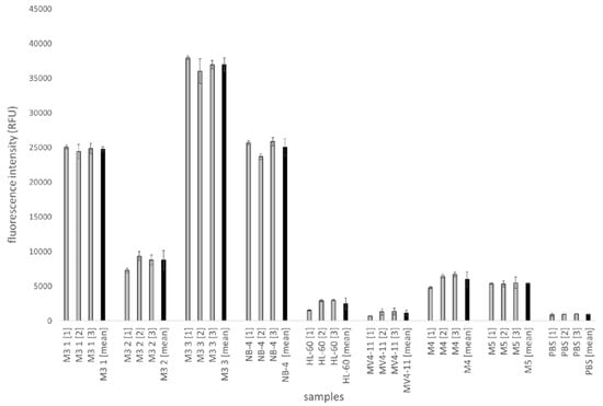 Patient samples M4 (1) (approx. 6000 RFU) and M5 (1) (approx. 5300 RFU) have lower fluorescence intensity values than M3 patient samples (Figure 7). The maximum standard deviation of the negative patient samples is approx. 500 RFU. NB-4 (approx. 25,000 RFU), HL-60 (2500 RFU), MV4-11 (1100 RFU) and PBS (900 RFU) were also analyzed as control samples. The results show that the M3 (2) RFU values are significantly lower than the M3 1 and M3 3 and the NB-4 RFU values. It is also notable that values for M4 (1) and M5 (1) are on average approx. two times higher than those of negative controls HL-60, MV4-11 and PBS. However, the values for M4 1 and M5 1 are approximately four times lower than the RFU values of NB-4-positive control. Three independent measurements in triplicates show that the fluorescence intensity values for the samples could be reproduced.