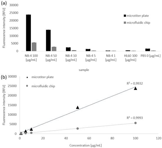 The assay solution in the reaction tube and the microfluidic chip contain 10–0.1 µg total cell lysate. The experiments show that comparable results can be achieved either with the measurement methods in the multiwell plate and the microfluidic chip, although the fluorescence intensity in the microfluidic chip is lower due to the smaller measurement volume (Figure 6a). The concentration measurements were compared to those shown in an XY-point plot (Figure 6b). The regression coefficient is 0.9932 for multiwell plate measurements and 0.9993 for microfluidic channel measurements. This presents the linear relationship between the measurement signal and the concentration of NB-4 lysate in the assay wells. Therefore, it can be assumed that the fluorescence signal is dependent on the NB-4 lysate concentration and thus on the PML-RARα concentration in cell lysates. The results also show that PML-RARα can be detected in total NB-4 cell lysate with a concentration of 5 ng/µL in reaction tube and microfluidic chips. The detection method is also valid for the detection by microfluidic chip.