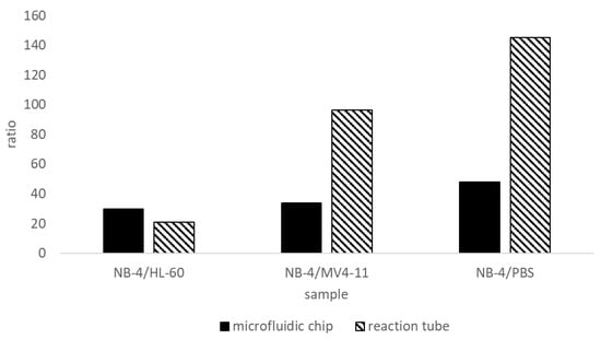 Absolute fluorescence intensity values for analyses in the microfluidic chip are much lower than the values for analyses in the multiwell plate. The fluorescence intensity of the positive control (NB-4) is about 30 times lower than the values in the microfluidic plate. The ratios between the intensity values of the different samples are similar. The lower fluorescence intensity can be explained by the lower measurement volume in microfluidic chip