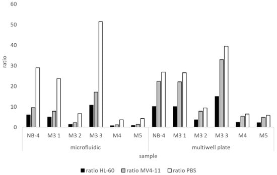 For a better interpretation of fluorescence intensity values of the patients’ samples, the ratios of sample to negative controls (HL-60, MV4-11 and PBS) were calculated. Results are shown for the multiwell plate and the microfluidic chip in Figure 10. The figure was created with the data from Figure 7 and Figure 8. Positive/negative ratios show a similar tendency in both the microfluidic chip and the multiwell plate. The positive/negative ratio is lower for HL-60 than for MV4-11 and lower for MV4-11 than for PBS. Looking at the samples, it is remarkable that the samples M3 (1) and M3 (3) always have a ratio of more than five, similar to positive control NB-4. M3 (2) shows the lowest positive/negative ratio of the M3 samples. Compared to the negative patient samples M4 and M5 the ratios of M3 (2) are higher. This is also shown in Figure 7 and Figure 8. The RFU values for the M3 (2) sample, both inside and outside the microfluidic chip, are higher than the values of the M4 and M5 samples.