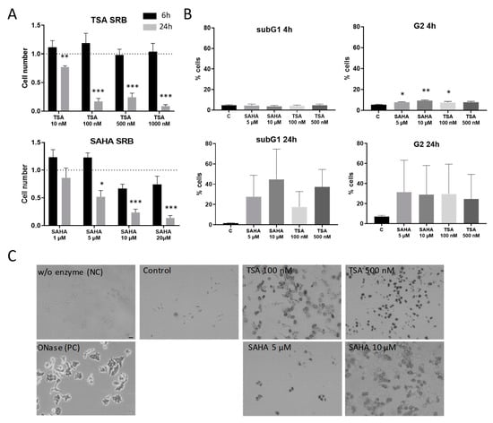 Effects of trichostatin A (TSA) and suberoylanilide hydroxamic acid (SAHA) on cell proliferation and apoptosis induction. (A): Cytotoxicity and cell proliferation were assessed by the sulforhodamine B (SRB) assay after 6 and 24 h incubation time, respectively, at different concentrations of TSA and SAHA (6 h: n = 4; 24 h: n = 3). The cell number of vehicle-treated cells was set as “1” indicated by the dotted line. (B): Flow cytometric analysis of cell cycle distribution and apoptosis induction 4 and 24 h after treatment with TSA and SAHA (n = 4). (C): TUNEL staining 24 h after TSA and SAHA administration. A preparation without enzyme served as negative control, cells treated with DNase as positive control. The picture shows representative stainings from three independent incubations. Scale Bar: 50 µm. * p < 0.05, ** p < 0.01, *** p < 0.001; statistically significant difference as compared to vehicle-treated control.