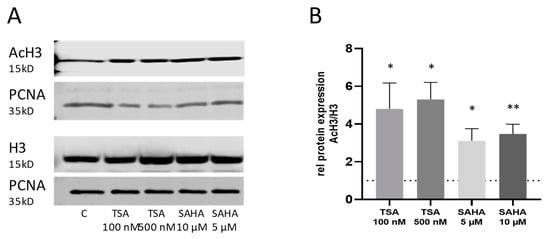 Histone-deacetylase (HDAC) activity after TSA and SAHA treatment. (A): Western blot analysis of nuclear histone H3 acetylation after 4 h incubation with TSA and SAHA at the indicated concentrations. The pictures show representative blots. (B): Densitometric analysis of all blots (n = 4–5/group). For better comparison, the acetylation levels were normalized to vehicle-treated control cells which have been set as “1” indicated by the dotted line. * p < 0.05, ** p < 0.01 statistically significant difference as compared to vehicle-treated control. AcH3: Acetyl histone H3; PCNA: proliferating-cell-nuclear-antigen.