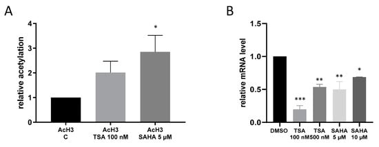 The efficacy of TSA and SAHA to inhibit HDAC activity was proven by a significant increase in acetylated histone H3 protein (Figure 2).