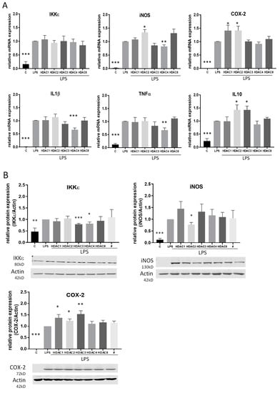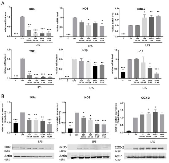 Effects of HDACi on lipopolysaccharide (LPS)-induced inflammatory gene expression. (A): mRNA expression analysis of inflammatory genes 4 h after LPS incubation with and without addition of TSA and SAHA at the indicated concentrations. (B): Western blot analysis of inflammatory genes after treatment of cells with LPS with and without SAHA or TSA for 6 h, respectively. The blots show one representative result, the diagrams the densitometric analysis of all blots (n = 5–6), * p < 0.05, ** p < 0.01, *** p < 0.001, statistically significant difference as compared to LPS-treated control.