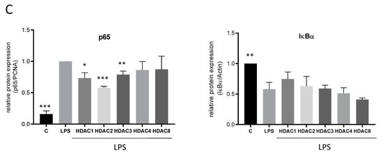 RAW264.7 cells were seeded on 24-well plates at a density of 2 × 105 cells/well and cultivated for 24 h. Pre-evaluated siRNAs against HDAC 1, 2, 3, 4 and 8 as well as scrambled control oligonucleotides were purchased from Thermo Fisher Scientific (Schwerte, Germany) (Silencer Select siRNA against mouse HDAC). Transfection of RAW264.7 cells was performed using Lipofectamine RNAiMAX transfection reagent (Thermo Fisher Scientific (Schwerte, Germany) as recommended by the manufacturer. Briefly, siRNA as well as Lipofectamine were mixed with Opti-MEM medium in separate tubes and were combined and incubated for 5 min at room temperature. Then, the lipofectamine—siRNA mix was added to the cell culture medium. Cells were incubated with siRNA over a time period of 42 h before incubation with LPS started. For siRNA experiments, Lipofectamine-treated macrophages were used as controls.