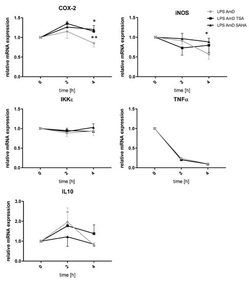 Effects of TSA and SAHA on mRNA stability of LPS-induced inflammatory genes. mRNA stability was assessed by blocking transcription with actinomycin (AmD) (1 µg/mL). RAW264.7 cells were incubated with LPS for 24 h before TSA and SAHA were added together with actinomycin for 2 and 4 h. The time point of actinomycin addition was set as baseline (“1”). (n = 4). * p < 0.05, ** p < 0.01, statistically significant difference as compared to LPS/actinomycin-treated control.