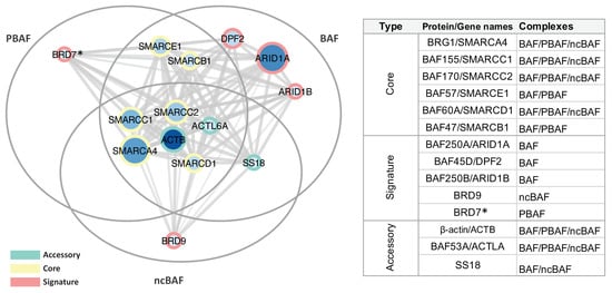 The bubble plot showing clusterization of proteins identified by LC-MS/MS according to the architecture of the three classes of mammalian SWI/SNF complexes (i.e., BAF, PBAF, and ncBAF) was performed through the ggplot2 package v 3.3.1 of the RStudio v 1.2.1335 environment for R (http://www.R-project.org), according to Mashtalir et al. [] and based on classification of the SWI/SNF Infobase database (http://scbt.sastra.edu/swisnfdb/).