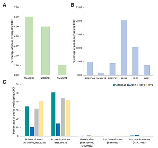 Percentages of peaks from ChIP-seq experiments for each SWI/SNF subunit overlapping CTCF ChIP-seq peaks in HeLa-S3 (A) and K562 (B) cell lines; (C) Bar charts reflecting percentages of the number of SWI/SNF subunit peaks overlapping CTCF with the histone markers associated with the specified chromatin features in K562 cells.