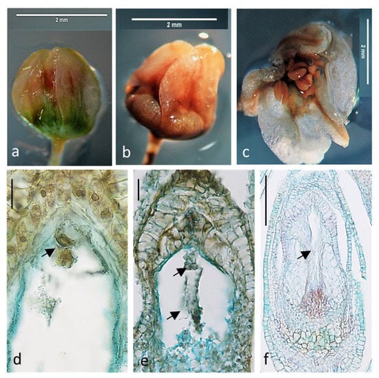 Fagopyrum esculentum (cv. ‘Korona’) floral buds and their internal ovule and embryo sac development impairment cultured in vitro on media with different content of sugar, vitamins, and macro- and microelements. The same features were observed in cv. ‘Panda’: (a) bud laid out on Medium 1 with full content of nutrients at the time 0; (b) bud after 10 days of culture on Medium 1 with 30% content of nutrients; (c) bud after 10 days of culture on Medium 1 with full content of nutrients; (d,e) degeneration of the cells of embryo sacs (arrows); and (e) shrunken embryo sac (arrow). Bars: (d,e) 20 µm; and (f) 200 µm. For media content, see Section 4.