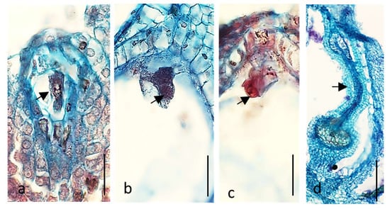 In planta degeneration of the embryo sacs cells and ovules after removal of 75% of flowers in Fagopyrum esculentum (cv. ‘Korona’). The same features were observed in cv. ‘Panda’: (a) 1-nucleate embryo sac (arrow); (b,c) egg apparatus of seven-cell embryo sacs (arrows); and (d) the whole ovule (arrow). Bars (a–c) 20 µm; and (d) 100 µm.
