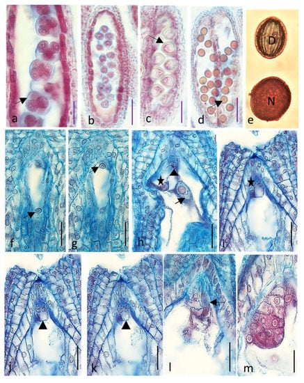 Normal pollen, female gametophyte and embryo development in Fagopyrum esculentum (cv. ‘Korona’) after removal of 50% of flowers. The same features were observed in cv. ‘Panda’: (a) tetrads of microspores in blue callose sheath (arrow); (b) microspores released from the callose sheath; (c) vacuolated microspores with thick sporodermis (arrow); (d) 1-nucleate pollen grains, nuclei visible (arrow); (e) degenerated (D) and normal (N) pollen grains stained with Alexander dye; (f,g) 2-nucleate embryo sac-successive stages, nuclei marked with arrows; (h–k) cells of two seven-cell embryo sacs (antipodal cells not shown) with secondary nucleus (arrow), egg cell (stars), and synergids (triangles); (i–k) successive stages of the same embryo sac; (l) pollen tube penetrating one of the two synergids (arrow); and (m) globular proembryo. Bars: (a,f–m) 20 µm; (b,c) 50 µm; and (d) 100 µm.