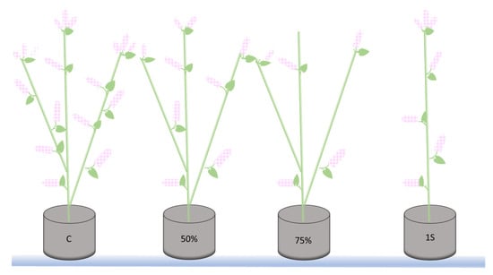 Inflorescences and lateral stem removal performed during in planta experiments on Fagopyrum esculentum in 2019 and 2020. C, control plant with all lateral ramifications and with all inflorescences; 50%, plant with half of the spike of spikelets (every second removed); 75%, plant with only 25% of spike of spikelets (every second, third, and fourth removed); 1S, single shoot plant (all lateral ramifications removed).