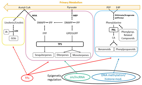 Overview of the main volatile organic compounds’ biosynthetic pathways: terpenoids (pink), phenylpropanoids/benzenoids (blue) and fatty acid derivatives (yellow). Volatile organic compounds (VOCs) are secondary metabolites of which the precursors are products of primary metabolism. These are transformed into volatile terpenes (monoterpenes, diterpenes and sesquiterpenes) by the mevalonic acid (MVA) and methyleruthirol phosphate (MEP) pathways. Phenylpropanoid/benzenoid biosynthesis follows the shikimate and arogenate pathways. Meanwhile, fatty acid derivatives such as jasmonate (JA) and green leaf volatiles (GLVs) come from the lipoxygenase (LOX) pathway. Volatile terpenoids and phenylpropanoids are transcriptionally controlled by transcription factors (continuous lines) and may be epigenetically controlled by small and long non-conding RNA, as well as by DNA methylation and histone modification (dashed lines). Volatile fatty acid derivatives may be regulated by transcription factors (TFs) and epigenetic mechanisms.