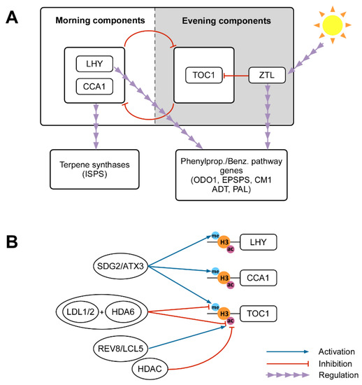 Circadian rhythmic emission of volatiles is regulated by the expression of key genes, which may also determine the rhythmicity of downstream volatile emissions, modifying the expression of genes at the final steps of biosynthetic pathways. Genes implied in VOC biosynthesis can be temporally regulated by transcription factors (TF) coded by clock genes [4,110], which may act as regulators of the rhythmic emission of volatiles [111]. The main components of the circadian clock have been elucidated in Arabidopsis thaliana [117] but they are highly conserved across many plant species [118]. The CIRCADIAN CLOCK ASSOCIATED 1 (CCA1) and LATE ELONGATED HYPOCOTYL (LHY), known as morning components, along with the response regulator CCT-domain protein TIMING OF CAB EXPRESSSION 1 (TOC1) and ZEITLUPE (ZTL), known as evening components, form the main oscillator at the core of the plant circadian clock, based on transcriptional/translational negative feedback loops involving these clock genes (Figure 2A). CCA1 and LHY inhibit the expression of TOC1; the TOC1 protein also represses CCA1/LHY; and ZTL ubiquitinates TOC1 for degradation as a response to blue light [119,120]. The daily oscillation of light and temperature are the main exogenous cues for the plant’s circadian clock [121]. In the gray poplar (Populus × canescens), diurnal variation in terpene emission is associated with oscillations in the expression of genes encoding for isoprene synthases (ISPS), which are controlled by the presence of circadian regulatory elements (CCA1/LHY) in the promoter sequence of ISPS [66]. Furthermore, the clock gene LHY in Petunia × hybrida and tobacco (Nicotiana attenuata) controls the daily expression pattern of many phenylpropanoid/benzenoid genes and TFs (ODO1, EPSPS, CM1, ADT, PAL, etc.) and hence the production of these floral volatiles [111]. Although the expression of LHY leads to a decrease in the expression of many phenylpropanoid/benzenoid genes and the loss of emission, reducing its constitutive expression has an opposite effect [114,122]. In addition, ZTL repression in tobacco (and its ortholog in petunia, Petunia CHANEL (PhCHL)) leads to a decrease in floral scent emission [122].