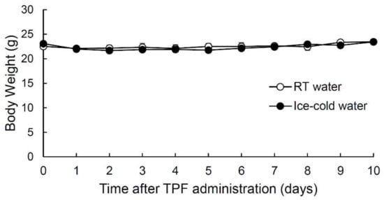 Patients undergoing chemotherapy were reported to exhibit a significant reduction in body weight []. Therefore, we monitored the time-course of the changes in the body weight of mice that drank room temperature (RT) water or ice-cold water after a single intraperitoneal injection of TPF (20 mg/kg docetaxel, 6 mg/kg cisplatin and 17 mg/kg 5-FU) (Figure 1, Supplementary Table S1). There was no significant change in body weight during the 10 days following TPF administration for both mice that drank RT water and those that drank ice-cold water (all p-values > 0.05, one-way analysis of variance (ANOVA) and Tukey’s post-hoc test). Furthermore, there were no significant differences in body weight between mice that drank RT water after TPF administration and those that drank ice-cold water (F1,60 = 0.34, p > 0.05, two-way repeated-measures ANOVA, effect of drinking condition; Figure 1, Supplementary Table S1). The above results indicate that the administration of TPF at the drug concentrations used did not cause severe injury to the mice. Therefore, we used this administration regimen for all subsequent experiments.