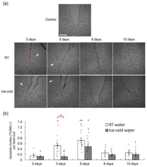 Terminal deoxynucleotidyl transferase-mediated dUTP nick end labeling (TUNEL) assays performed in the circumvallate papillae of mice that drank room temperature (RT) water or ice-cold water during the 10-day period following the intraperitoneal administration of TPF (docetaxel, cisplatin and 5-fluorouracil). (a) TUNEL signals (red) in the circumvallate papillae of mice that drank RT water or ice-cold water before (0 days) and 3, 5, 8 and 10 days after TPF administration. Arrowheads indicate TUNEL-positive apoptotic bodies. Dotted lines outline individual taste buds. Scale bar: 50 μm. (b) Quantitation of the number of TUNEL-positive cells per taste bud at different time points after TPF administration for mice that drank RT water and those that drank ice-cold water. Data are expressed as the mean ± SEM (n = 8–16 trenches each). Dots indicate individual data points. * (in black) p < 0.05 vs. control (0 days), ** (in black) p < 0.01 vs. control (0 days) (one-way analysis of variance (ANOVA) and Tukey’s post-hoc test); ** (in red) p < 0.01 for comparison between RT water and ice-cold water (two-way ANOVA and post-hoc t-test).