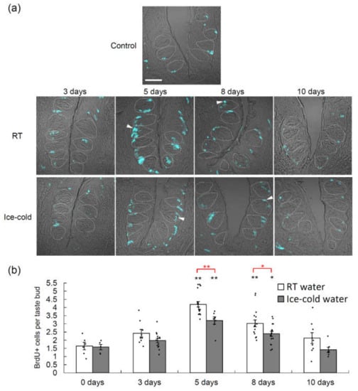 Bromodeoxyuridine (BrdU) is a thymidine analogue that is incorporated into newly synthesized DNA during the S-phase of the cell cycle and thus can be used to identify proliferating cells [,]. We performed BrdU-labeling experiments to evaluate taste cell proliferation at different time points after TPF administration (Figure 3, Supplementary Tables S1 and S3). For both groups of mice (those that drank RT water and those that drank ice-cold water), the BrdU signals in the taste buds of the CVP increased significantly after TPF administration and peaked at 5 days (p < 0.05 vs. control at days 5 and 8 for both groups, one-way ANOVA and Tukey’s post-hoc test; Figure 3, Supplementary Table S1) before declining to basal (control) levels. Furthermore, there was a significant difference in the number of cells expressing BrdU signals between mice that drank RT water and those that drank ice-cold water (F1,97 = 41.59, p < 0.001, two-way ANOVA, effect of drinking condition; Figure 3, Supplementary Table S1).