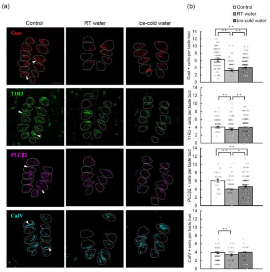 The number of taste bud cells expressing taste cell markers in mice that drank room temperature (RT) water or ice-cold water for 10 days following the administration of TPF (docetaxel, cisplatin and 5-fluorouracil). (a) Expression of gustducin (Gust, a G-protein mediating bitter and sweet taste transduction; red), taste receptor type 1 member 3 (T1R3, a sweet or umami receptor component; green), phospholipase C-beta 2 (PLCβ2, a bitter/sweet/umami transduction molecule; magenta) and carbonic anhydrase-4 (CaIV, a sour taste-sensitive cell marker; cyan) in the circumvallate papillae before (control) and 10 days after TPF administration in mice that drank RT water or ice-cold water. Arrows indicate marker-positive cells. Dotted lines outline individual taste buds. Scale bar: 50 μm. (b) Quantitation of the number of immunoreactive cells per taste bud. Data are expressed as the mean ± SEM (n = 100–286 taste buds, each). Dots indicate individual data points. * p < 0.05, ** p < 0.01 (one-way ANOVA and Tukey-Kramer post-hoc test).
