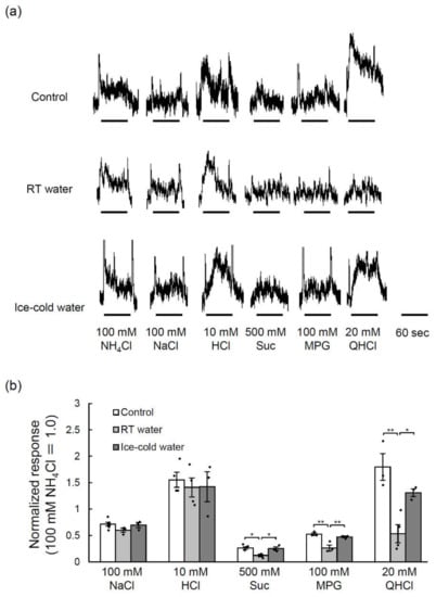 The magnitudes of the integrated whole-nerve responses were measured from 5 to 55 s after the onset of stimulation, averaged and normalized to the response to 100 mM NH4Cl to reduce inter-mouse variations in the absolute responses. The relative responses were compared between groups (RT water vs. ice-cold water) using one-way ANOVA and the Tukey-Kramer post-hoc test.
