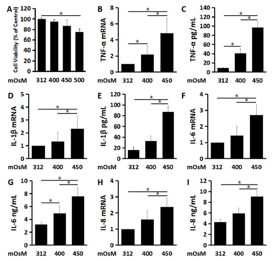 Primary HCECs cultured in the isosmolar medium (312 mOsM), were switched to the hyperosmolar medium (400, 450 or 500 mOsM) with the addition of 44, 69 or 94 mM of NaCl, respectively. As evaluated by MTT cell viability assay (Figure 1A), HCECs survived well in the medium at 400 and 450 mOsM while some cells may be damaged with lower viability rates in 500 mOsM medium (p < 0.05, compared with 312 mOsM). Therefore, 500 mOsM was excluded for the subsequent study. Both the mRNA expression and protein production of pro-inflammatory cytokines TNF-α (Figure 1B,C), IL-1β (Figure 1D,E) and IL-6 (Figure 1F,G), as well as chemokine IL-8 (Figure 1H,I) were greatly increased with the increasing osmolarity.