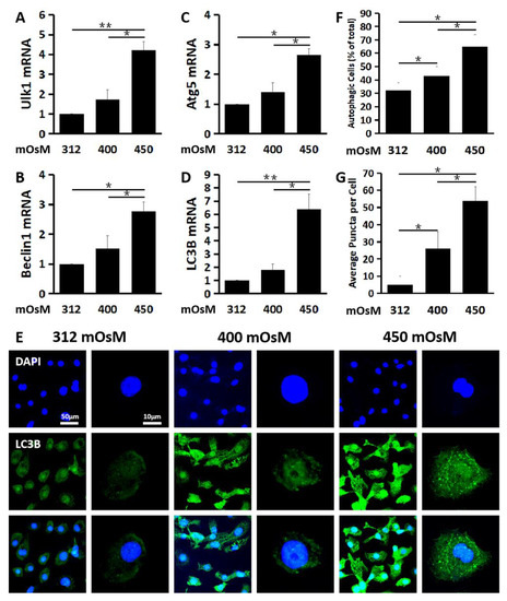 Autophagy begins with activation of Ulk1 in the initiation phase, which stimulates Beclin1 in the nucleation phase to regulate and generate formation of the nascent autophagosome in the elongation phase whereby cytosolic components are enclosed into an isolation membrane. We found that the expression of Ulk1 (Figure 2A) in the initiation phase, Beclin1 (Figure 2B) in the nucleation phase and Atg5 (Figure 2C) and LC3B (Figure 2D) in the elongation phase were all significantly activated in HCECs exposed to hyperosmolar medium at 450 mOsM, as evaluated by RT-qPCR. Ulk1 mRNA expression was stimulated to 1.74 ± 0.49 and 4.21 ± 0.43 fold, Beclin1 mRNA was stimulated to 1.51 ± 0.43 and 2.76 ± 0.32 fold and Atg5 mRNA increased to 1.41 ± 0.30 and 2.65 ± 0.22 fold, respectively, when exposed to 400 and 450 mOsM medium (n = 3, Figure 2A–C).
