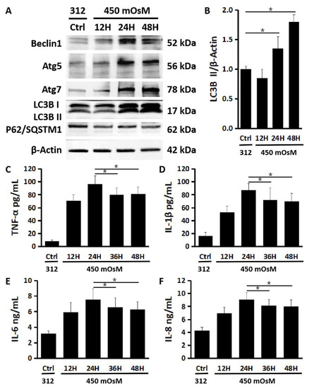 Time-dependent effect of hyperosmotic stress on autophagy activation and inflammation in primary HCECs. (A) Western blot showed that the protein production of Beclin1, Atg5 and Atg7, as well as LC3B turnover increased while production of p62/SQSTM1 decreased significantly in 24–48 h after HCECs were exposed to 450 mOsM medium, with β-Actin serving as internal control. (B) Quantitative ratio of LC3B II/β-Actin showing increased LC3B turnover in 24–48 h after HCECs were exposed to 450 mOsM. (C–F) ELISA analyses. The pro-inflammatory cytokines, TNF-α (C), IL-1β (D) and IL-6 (E), as well as chemokine IL-8 (F) was suppressed after 24 h in HCECs exposed to 450 mOsM. Data are mean ± SD of three independent experiments. * p < 0.05, compared within groups.