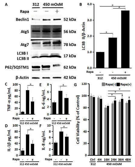 Meanwhile, the release of inflammatory cytokines was suppressed by rapamycin, evidenced by much lower levels of TNF-α (43.17 ± 12.64 pg/mL), IL-1β (40.11 ± 11.06 pg/mL), IL-6 (4.38 ± 0.84 ng/mL) and IL-8 (6.13 ± 0.79 ng/mL) protein levels in the medium supernatants (Figure 4C–F). Interestingly, rapamycin significantly rescued the cell viability reduced by hyperosmolarity, especially after 2 h (16 h (83.1 ± 3.2%) Rapa (+) vs. 24 h (91.8 ± 2.1%), 36 h (95.0 ± 2.8%) or 48 h (93.2 ± 1.8%) Rapa (+), p < 0.05; Rapa (−) vs. Rapa (+) at 24 h (87.9 ± 3.0% vs. 91.8 ± 2.1%), 36 h (90.3 ± 2.9% vs. 95.0 ± 2.8%), or 48 h (88.2 ± 2.0% vs. 93.2 ± 1.8%), p < 0.05; Figure 4G).